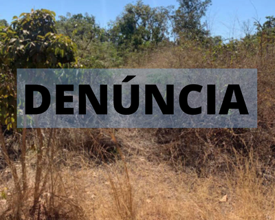 Imagem da Terra Indígena Areões, parte da mata, local onde ocorreu o crime. Ao centro da imagem está a palavra denúncia escrita com letras pretas maiúsculas.