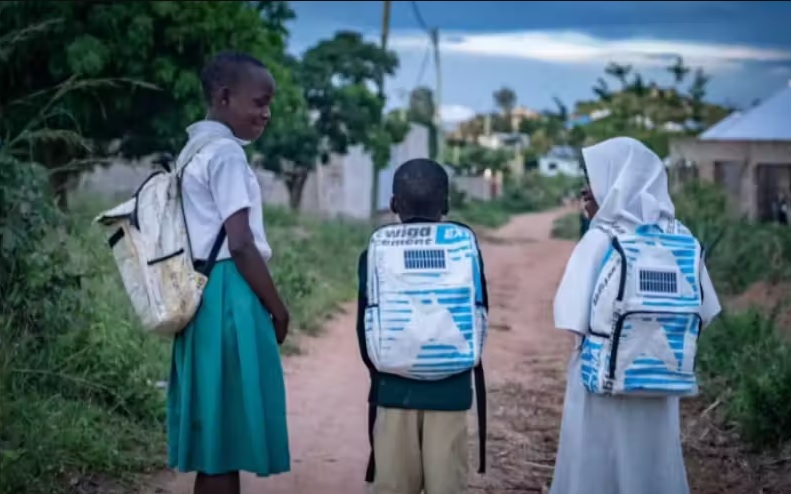 As mochilas que têm carregamento solar ajudam crianças que vivem em áreas sem energia elétrica. O autor do projeto sofreu com o problema quando era pequeno. – Foto: PNUD Tanzânia/KumiMedia
