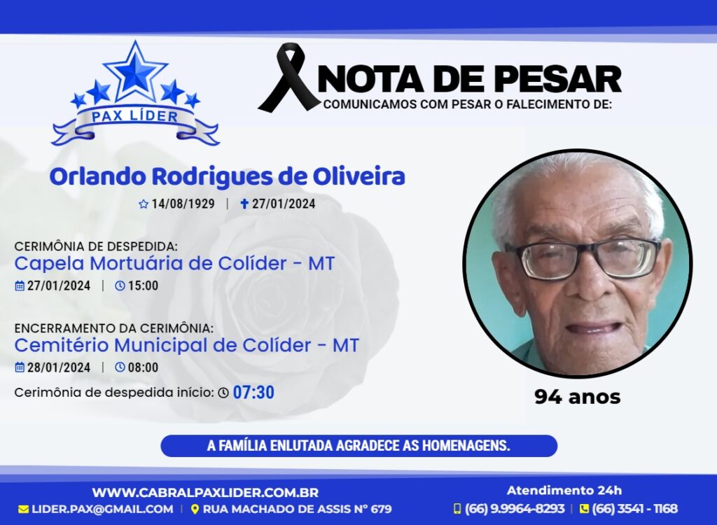 É com grande pesar que registramos o falecimento do pioneiro colidense Sr. Orlando Rodrigues de Oliveira, 94 anos, natural de Ituaçu, Bahia. Ele deixa um rico legado marcado por fraternidade e bondade, o que o levou a conquistar em Colider muitos amigos, especialmente na Comunidade Frei Galvão de onde foi Ministro da Eucaristia por muitos anos.