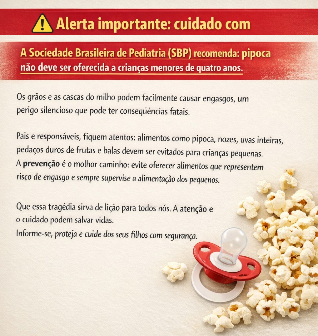 A Sociedade Brasileira de Pediatria (SBP) alerta que pipoca não deve ser oferecida a crianças menores de quatro anos, devido ao alto risco de engasgo causado pelos grãos e pelas cascas do milho. Especialistas reforçam que acidentes como esse podem ocorrer de forma rápida e silenciosa, tornando a prevenção fundamental para salvar vidas.