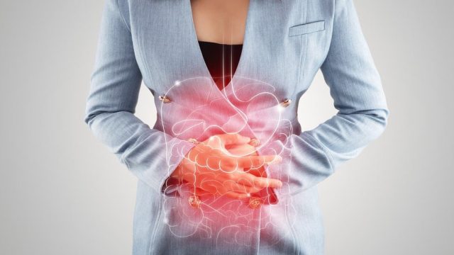 Ilustração gráfica de uma mulher sofrendo com gastrite