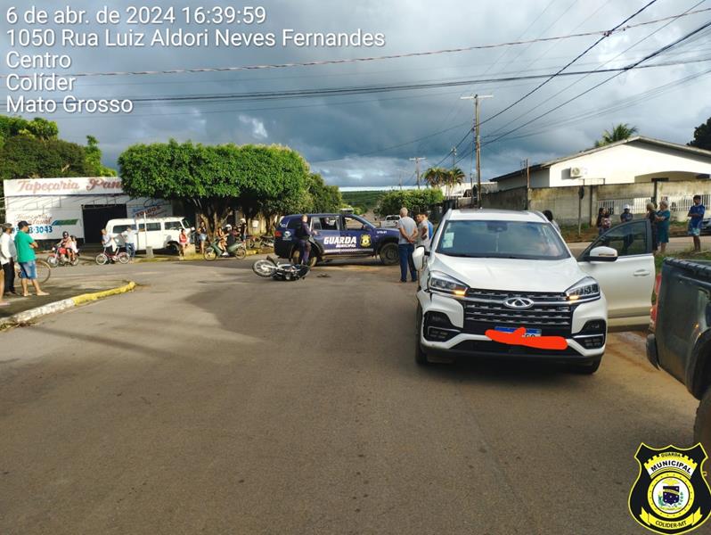 Acidente ocorrido na tarde deste sábado(06), na Rua Luiz Aldori Neves Fernandes com Rua Caiabis, em Colider, envolveu um veículo Chery Tiggo 08 e uma moto Titan.