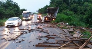 Na colisão parte da carroceria do caminhão dos correios foi arrancada, e tanto a carga de madeira como as encomendas ficaram espalhadas pela rodovia.