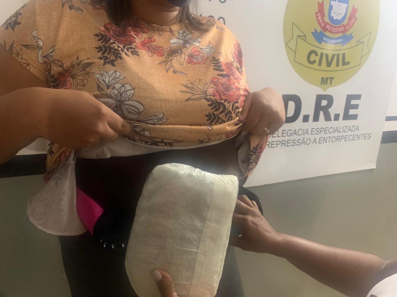 A peça da substância ilícita envolta em saco plástico, estava presa com fita adesiva no corpo de uma mulher, na região da cintura. A suspeita de 21 anos foi autuada em flagrante pelo crime de tráfico de drogas.
