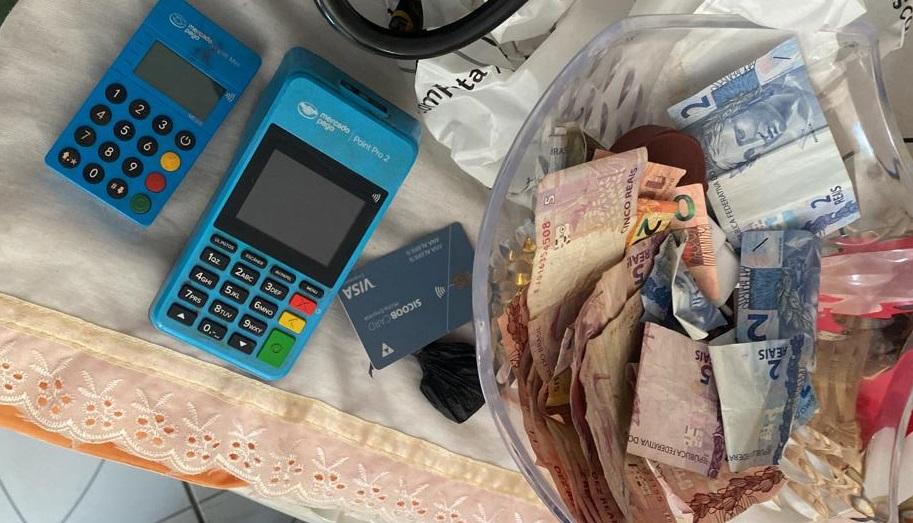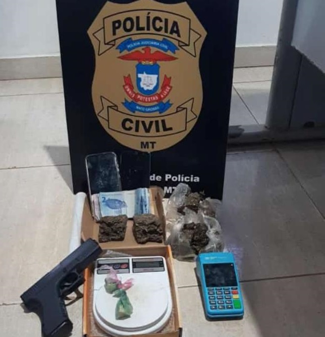 As equipes policiais apreenderam aparelhos celulares, diversas porções de entorpecentes, um simulacro de arma de fogo, balanças de precisão, máquinas de cartão de crédito e R$ 300, o que caracteriza a venda de entorpecentes.
