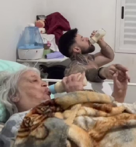 Neto adulto toma mamadeira com vovó doente e vídeo viraliza; amor e gratidão