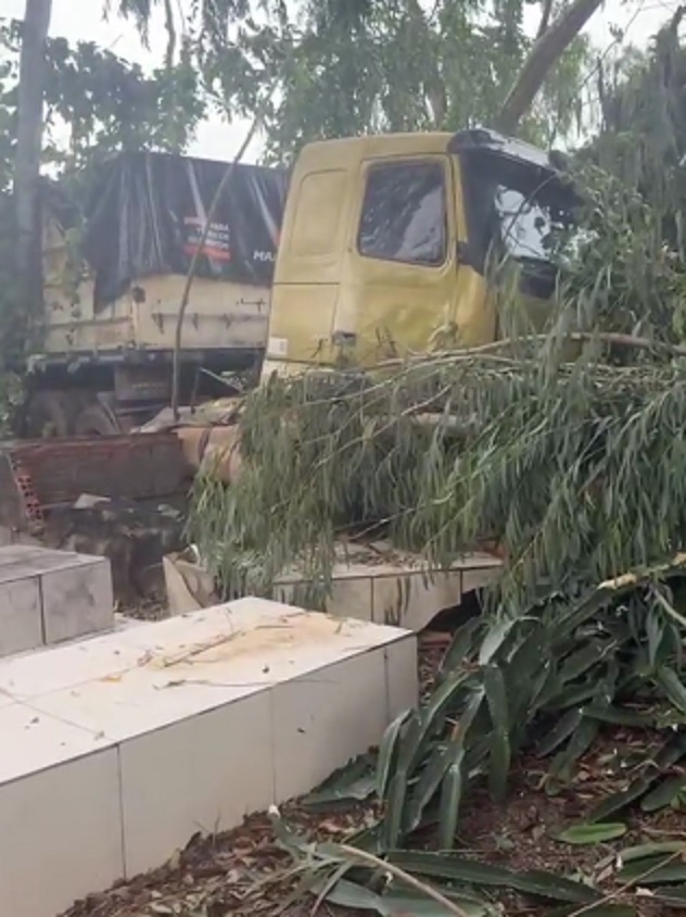 O motorista tenta entrar na cabine para segurar o veículo, sem sucesso. Dois trabalhadores que estavam em cima da carga pularam da carreta em movimento e, na sequência, ela invade o cemitério.