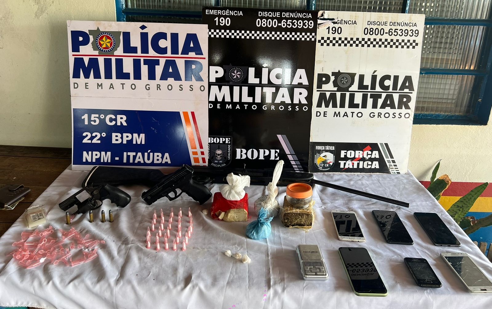 Na ação, foram apreendidos um revólver calibre 38, uma espingarda calibre 22, um simulacro tipo pistola, 35 porções de cocaína e maconha e vários pinos para armazenar entorpecentes e aparelhos celulares.