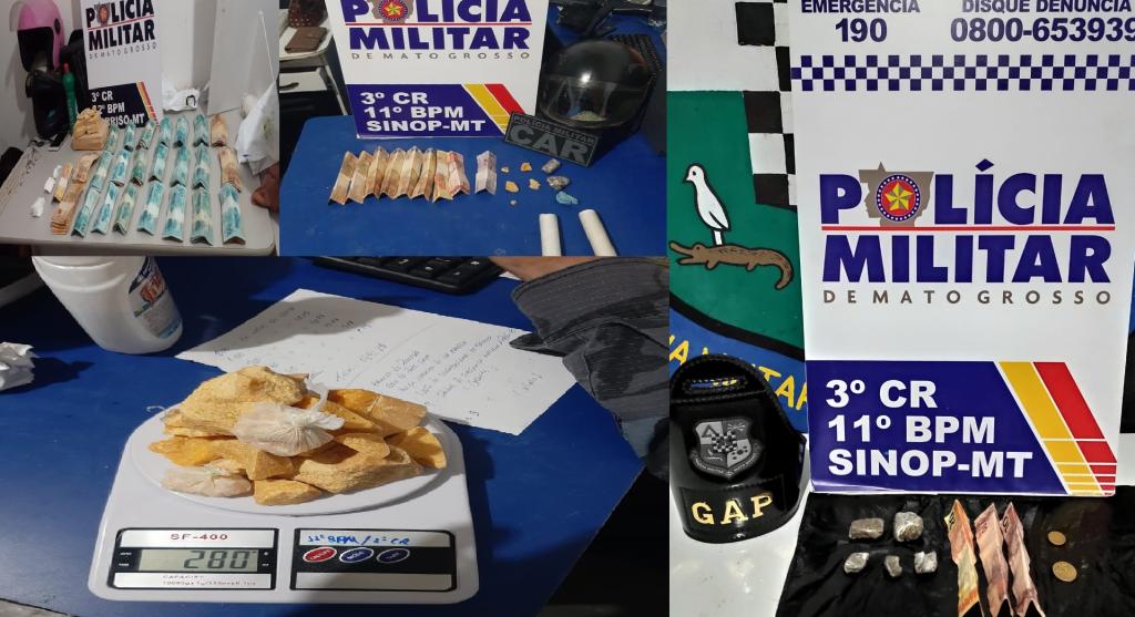 No bairro Maria Carolina, em Sinop, foram duas ocorrências. Na primeira, foi detido um casal que assumiu ser membro de uma organização criminosa e responsável pela venda de entorpecente na região. Com a dupla foram apreendidos R$ 1.692,00 e 12 porções de pasta base de cocaína, uma balança e rolo de plástico filme.