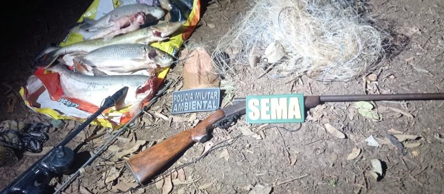 Durante patrulhamento noturno realizado na região do Rio Teles Pires, no fim de semana, os agentes ambientais encontraram um saco contendo 21 kg de pescado, das espécies curimba e cachorra, uma arma de fogo calibre 28, uma tarrafa, uma rede e um arpão. Os suspeitos não foram encontrados no local. Os materiais apreendidos foram encaminhados para providências policiais.