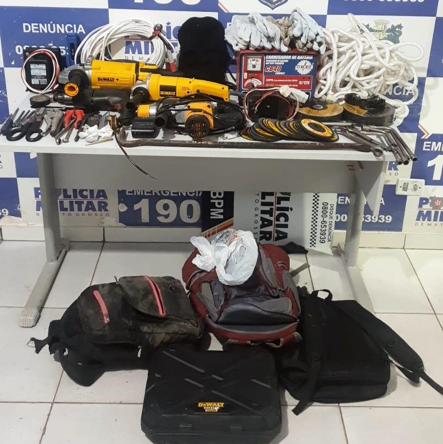 Com os suspeitos, a PM apreendeu uma mochila com diversos equipamentos e acessórios, frustrando o crime