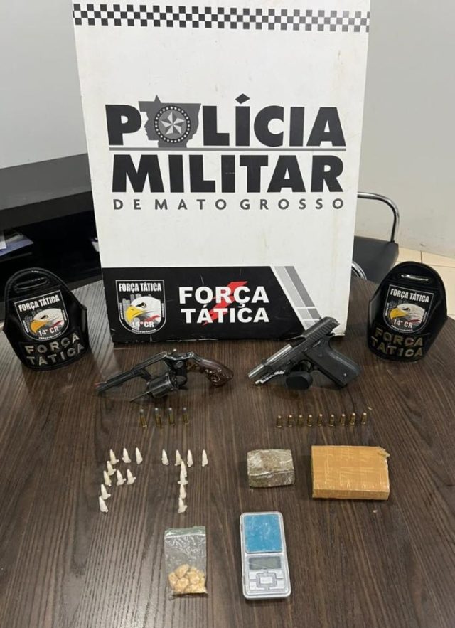 Policiais militares da Força Tática do 14º Comando Regional apreenderam duas armas de fogo e porções de drogas, nesta quarta-feira (15.10), em Nova Mutum. A ação envolveu dois homens faccionados, que reagiram com tiros à abordagem e entraram em confronto com a PM.