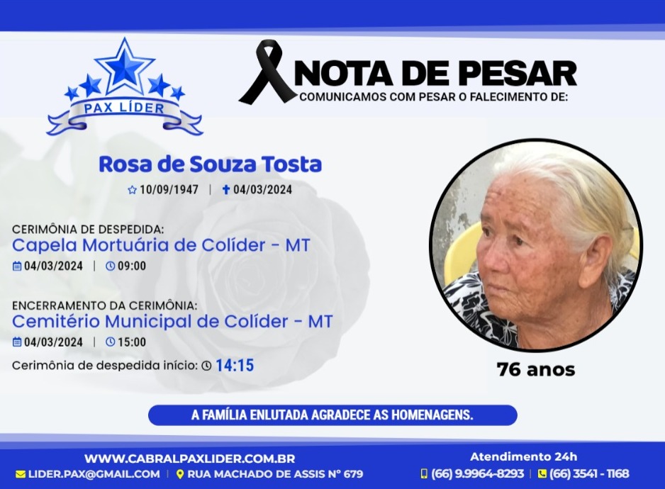 É com grande pesar que comunicamos o falecimento da pioneira colidense, senhora Rosa de Souza Tosta,(76)