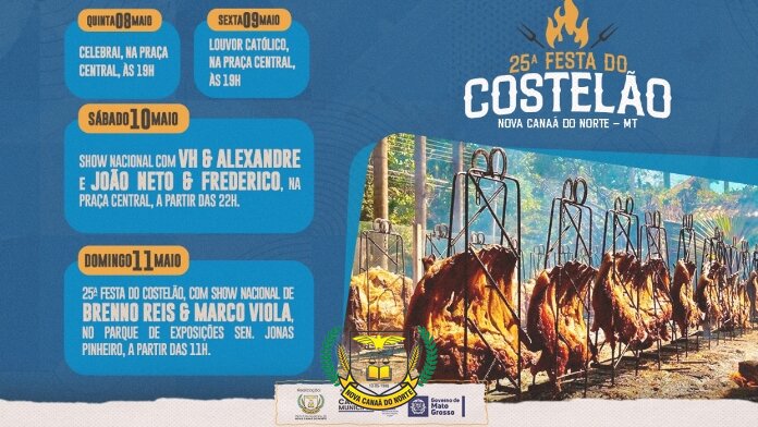 O ponto alto das comemorações será no domingo, 11 de maio, com o tradicional Costelão no Parque de Exposição Senador Jonas Pinheiro, a partir das 11h00. Além do delicioso churrasco, o evento contará com o show nacional da dupla Breno Reis & Marco Viola, que trará hits como “Pode Voltar Paixão” e “Piracicabano”, garantindo muita diversão e emoção.