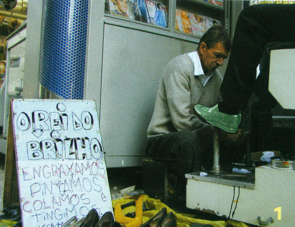 Está ele ali à s tardes, acompanhado da caracterÃstica cadeira elevada, para os fregueses; posiciona adequadamente sua caixa de engraxar e estende um pano, já enegrecido pelo uso, sobre o qual esparrama considerável número de sapatos, chinelos, botas e outros que tais, como a indicar um trabalho afanoso que o aguarda.