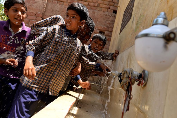 Crianças indianas brincam com água nos arredores de Nova Déli nesta quarta-feira (27). Onda de calor já matou mais de mil pessoas no país (Foto: Chandan Khanna/AFP)