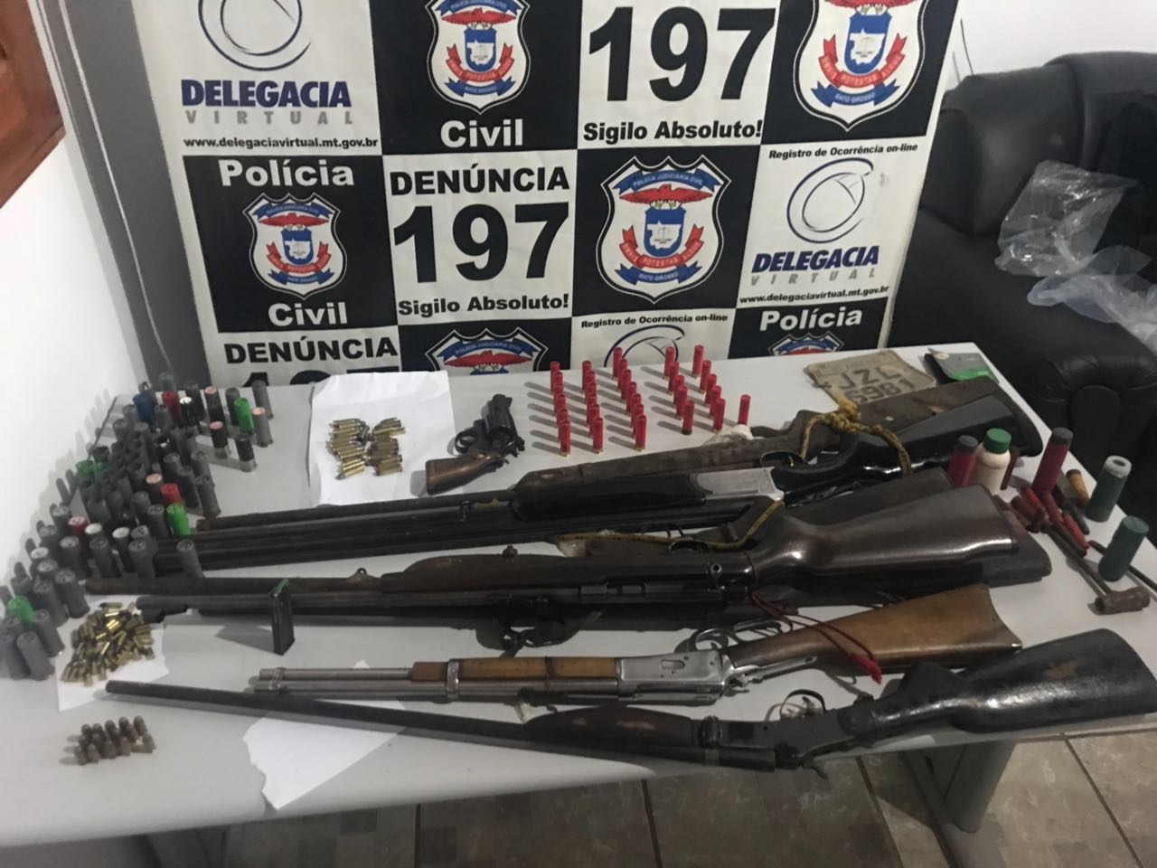 Em buscas em uma das propriedades, os policiais encontraram um desmanche de motocicletas, além de ser apreendido no local quatro armas de fogo e diversas munições. O suspeito D.S.L., 60, foi conduzido a delegacia, onde foi autuado em flagrante pelos crimes de receptação e posse ilegal de arma de fogo e munições.