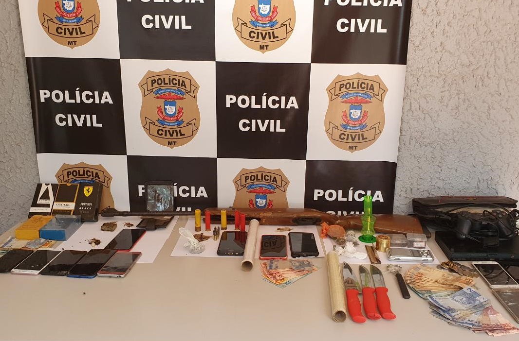 Durante as buscas, os policiais civis apreenderam armas, munições, dinheiro, aparelhos celulares, entorpecentes, entre outros produtos sem identificação da procedência.