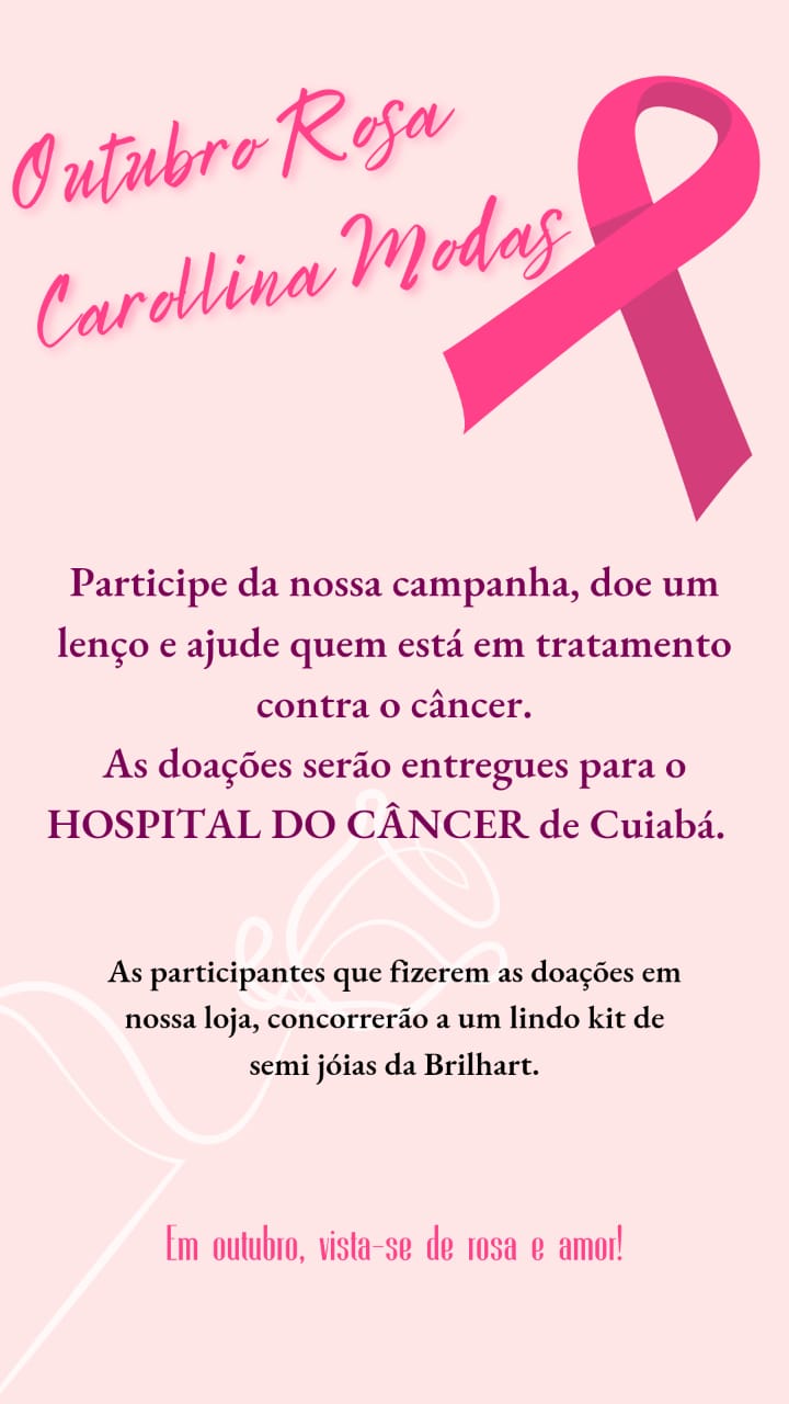 A Loja Carollina Modas, em Colider, em adesão a Campanha Outubro Rosa, de nível nacional, voltada a conscientização da prevenção, diagnóstico e tratamento precoce do câncer de mama e de colo do útero, atuando voluntariamente está promovendo no decorrer deste mês de outubro, com início nesta segunda-feira(04), uma Campanha de arrecadação de Lenços, Tocas, Chapéus, Bonés, Turbantes, e Boinas Femininas com o fim de repassar ao Hospital do Câncer de Cuiabá, onde serão DOADOS à mulheres que estão passando por processo de tratamento do câncer, cuja quimioterapia as deixa sem seus cabelos, o que provoca baixa autoestima, além do sofrimento que já enfrentam com a doença no decorrer do tratamento em busca da cura.