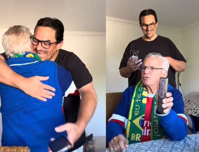 A cena é engraçada e emocionante ao mesmo tempo. Um filho brasileiro fez uma surpresa para o pai, que não via há tempos. O idoso achava que estava falando com o filho por uma chamada de vídeo, só que, na verdade, o Leandro Souto estava atrás do pai, na casa dele, fingindo que a ligação estava sem áudio. Ele apenas mexia a boca.