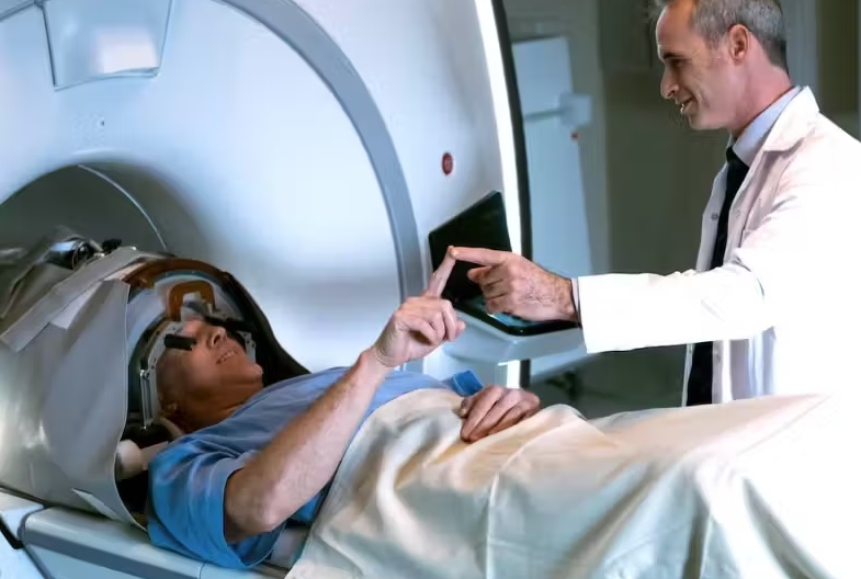 No tratamento, que leva apenas algumas horas, o paciente fica deitado com um capacete. Ele direciona raios diretamente nos locais mapeados pelo exame de imagem que mostra as áreas atingidas pela doença.