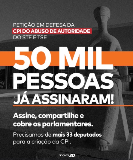 O partido Novo iniciou a coleta de assinatura para viabilizar um abaixo-assinado em defesa da abertura da CPI do Abuso de Autoridade do STF e do TSE. Até a manhã desta quinta-feira (18) já havia aproximadamente 70 mil signatários.