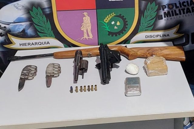 Equipes militares do 26º Batalhão prenderam um homem por porte ilegal de arma de fogo e tráfico de drogas, nesta segunda-feira (22.12), em Nova Mutum (241 km de Cuiabá). Os militares apreenderam uma carabina, um revólver, uma pistola airsoft, um tablete de maconha, porções de cocaína, dois socos ingleses adaptados e diversas munições.