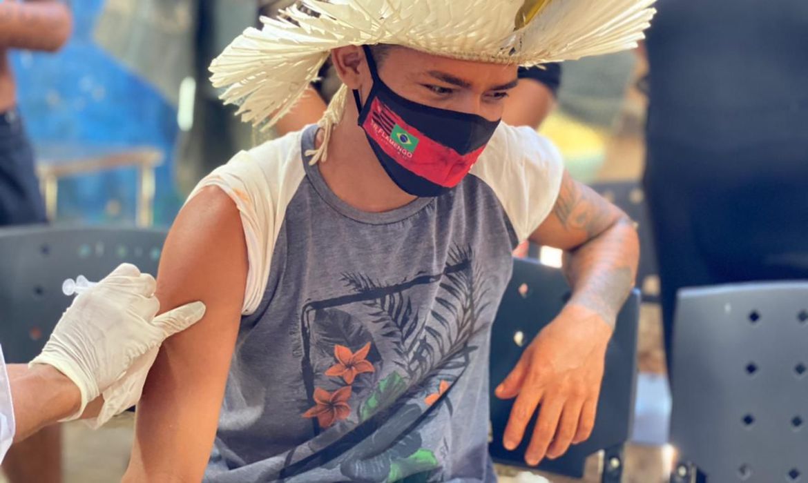 Jovem indigéna recebendo a dose da vacina contra a covid-19