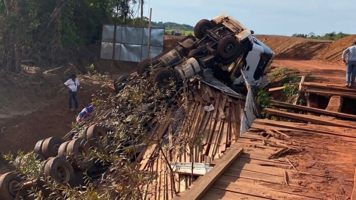 Na noite de quinta-feira (9), um caminhão tombou na ponte sobre o Rio Ribeirão Piabas, no município de Planalto da Serra, em um trecho da MT-140. A ponte de madeira se encontrava em péssimas condições e por isso, acabou ruindo durante o acidente. Conforme as informações de agricultores e caminhoneiros que passam pelo local, o motorista teve alguns ferimentos, mas se encontra bem.