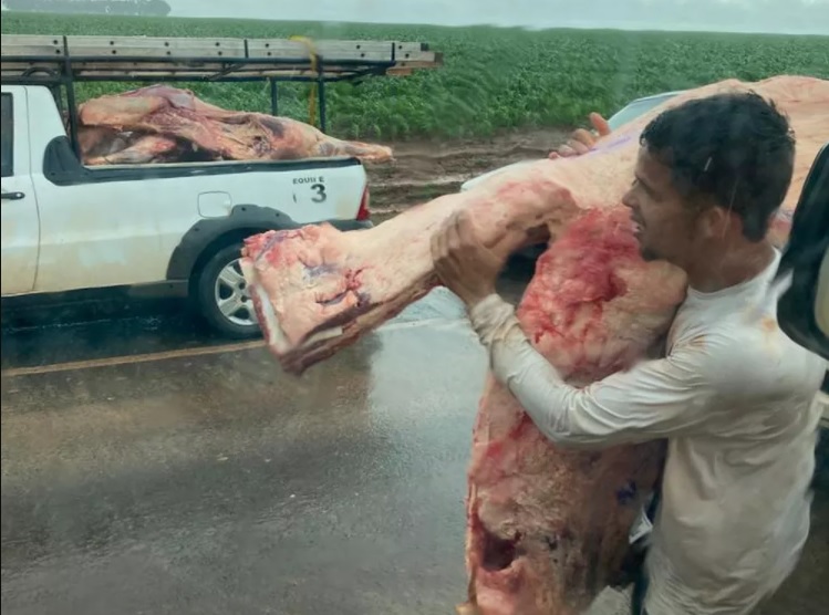 O caminhão tombou após o motorista perder o controle do veículo. Nas imagens, é possível ver as pessoas saindo com a carne e levando para os veículos.