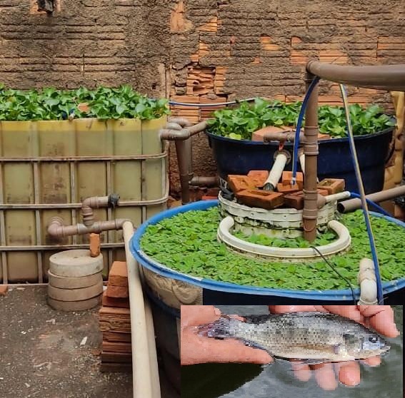 São utilizados como tanques de cultivo quatro caixas d’água de mil litros e mais três caixas de mil litros para o filtro mecânico/ biológico. O transporte da água entre os tanques de cultivo e o filtro ocorre por tubos de PVC através da pressão pneumática e uma bomba de 12 mil litros/hora, devolve a água do filtro para as caixas de cultivos. A bomba d´água fica ligada 24 horas por dia.