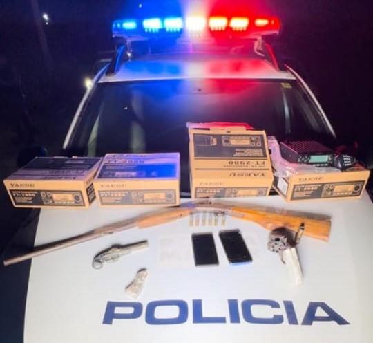 Posteriormente, os militares entraram no imóvel e prenderam outros dois integrantes da quadrilha. Na casa, foram localizados um revólver calibre 38, uma garrucha, uma espingarda, diversas munições e quatro rádios comunicadores. Os suspeitos, o veículo e todo material apreendido foram encaminhados à delegacia para registro do boletim de ocorrência e demais providências que o caso requer.