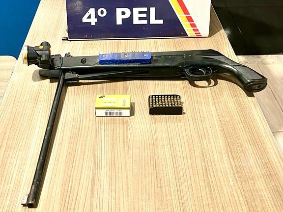 Em trabalho de diligências, o suspeito foi localizado nas imediações do imóvel. Ao ser questionado sobre a arma de fogo, informou que o material estava dentro da casa. Em buscas pela residência, os policiais militares encontraram uma espingarda adaptada para calibre .22 e uma caixa contendo 58 munições.