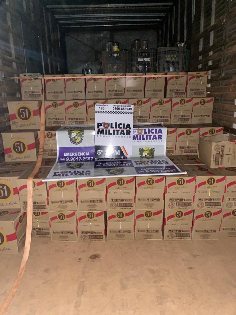 Em seguida, as equipes entraram no baú do caminhão e identificaram diversas caixas vazias e outras lacradas, que estavam escondidas. Ao todo, foram apreendidas 570 caixas de bebida alcóolicas – “pinga 51”.