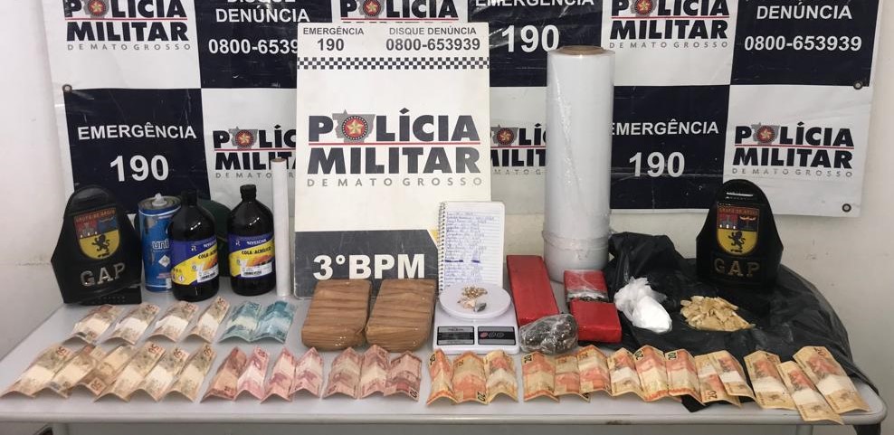 Policiais militares do 3º Batalhão apreenderam, nesta terça-feira (11.07), quase três quilos de pasta base, dois quilos de maconha, duas porções de cocaína e skank, além de produtos para embalagem dos entorpecentes, no bairro Pedregal, em Cuiabá. Um jovem, de 20 anos, foi preso em flagrante por resistência e tráfico de drogas.