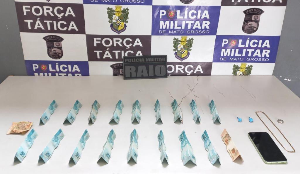 Policiais militares de Rondonópolis prenderam em flagrante uma mulher de 26 anos após o roubo de um veículo, no final da manhã desta segunda-feira (29.05). Na ação, a PM recuperou e devolveu o carro ao proprietário, além de apreender a quantia de R$ 1,8 mil em dinheiro e porções de drogas.