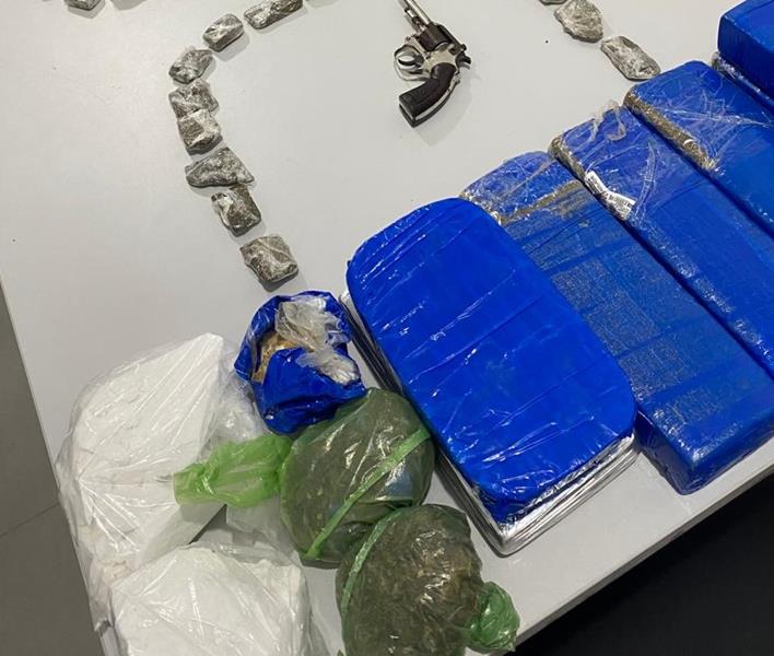 Duas pessoas foram detidas em flagrante por tráfico e apreendidas diversas porções de pasta base, cocaína e maconha, além de um revólver de calibre 22 e aparelhos celulares.