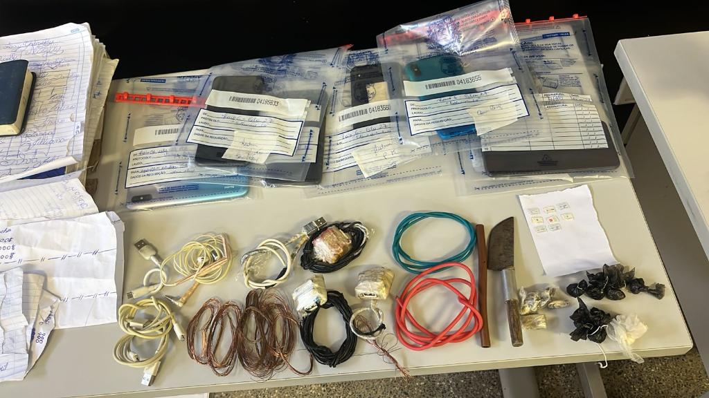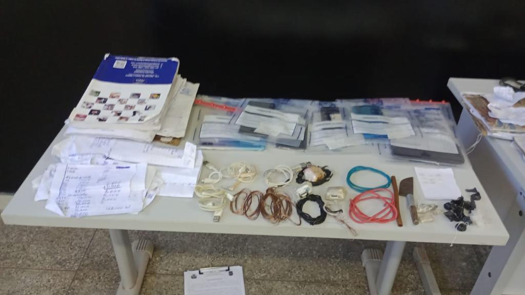 A ação resultou na apreensão de 13 aparelhos celulares, diversos carregadores, porções de drogas, entre maconha e cocaína, faca, cadernos de anotações, entre outros objetos, inclusive um mapa da cidade.