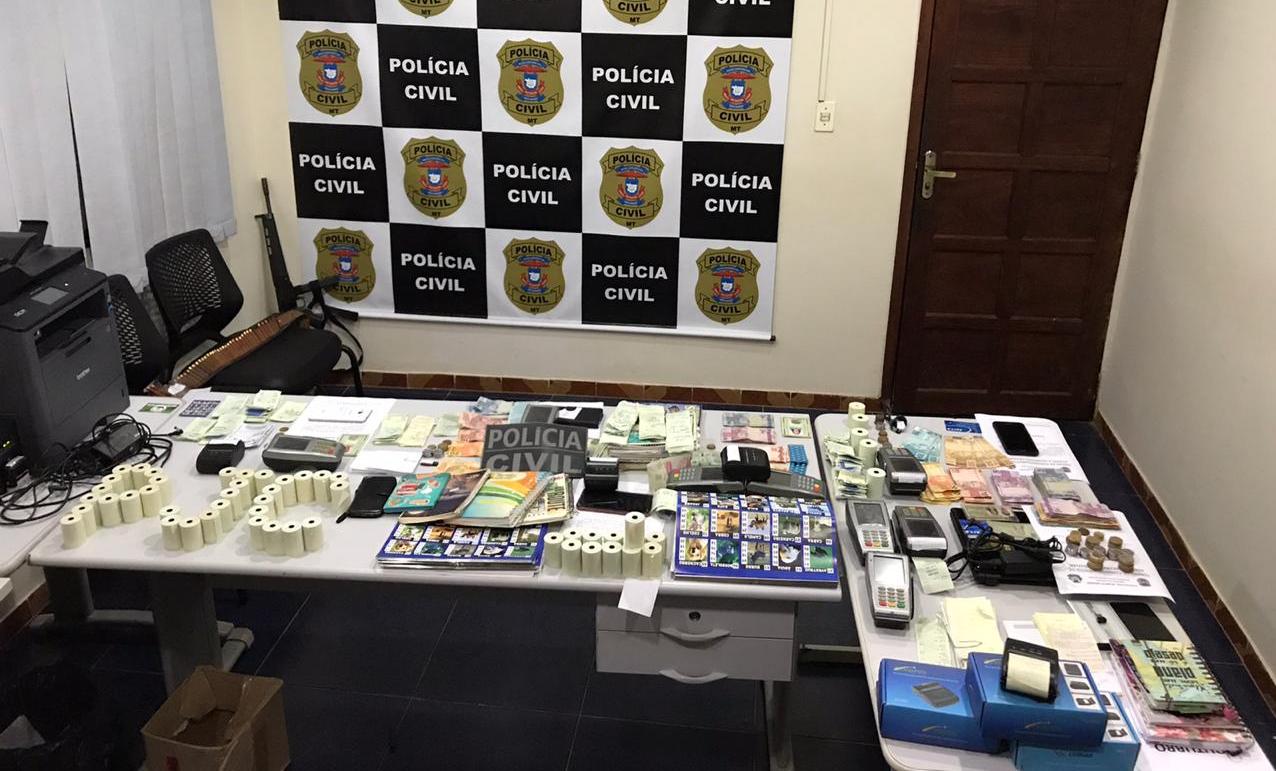 Foram apreendidos com os suspeitos: estimulantes sexuais de origem paraguaia e venda proibida no Brasil, aproximadamente R$ 3,7 mil em notas trocadas, vários extratos bancários, oito máquinas de jogo, diversas tabelas de bichos com valores e numeração dos animais, impressoras, notebooks, entre outros materiais.