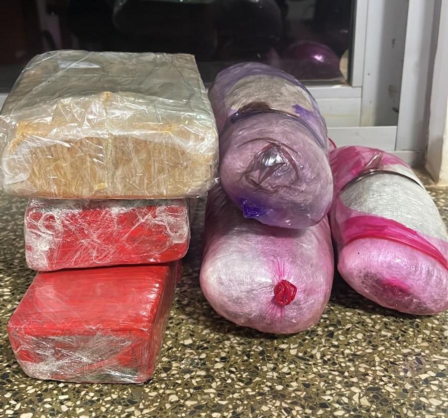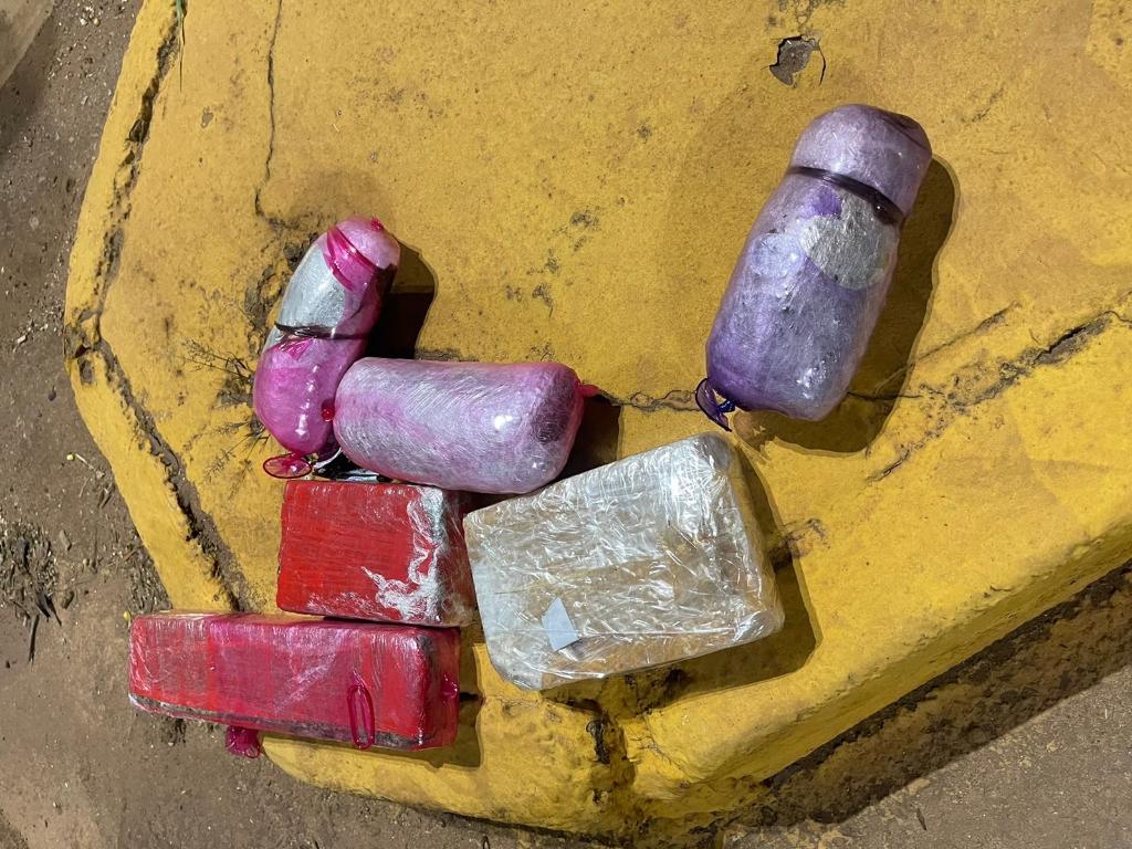 Em buscas no interior do carro, os policiais localizaram no compartimento de bagagens uma mochila, onde eram transportados seis invólucros de entorpecentes, sendo um tablete de pasta base de cocaína, dois tabletes de maconha e três pacotes de skunk (supermaconha).