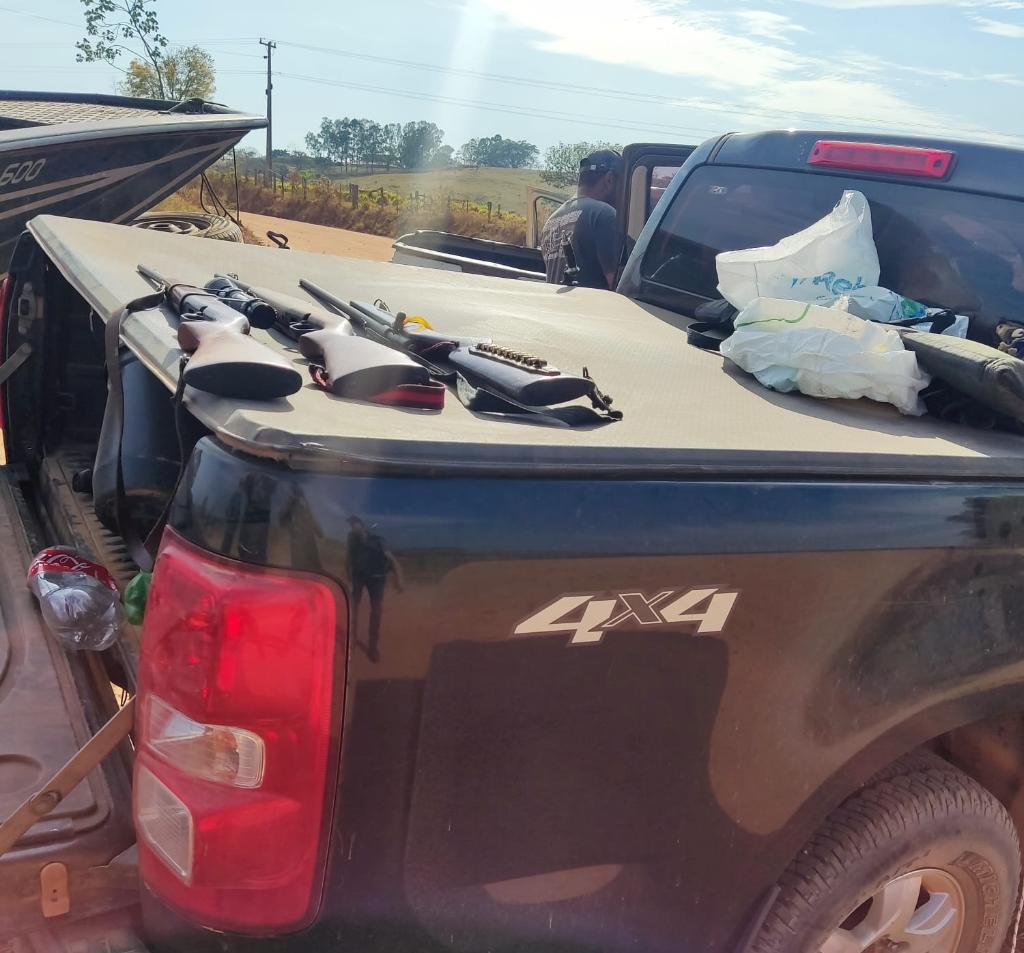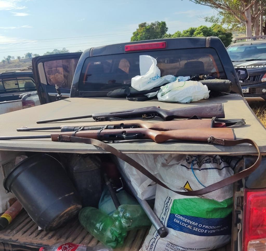 Durante buscas veiculares foram localizadas três armas de fogo (Carabinas), duas na S10 e outra na Picape Montana, carne de animal silvestre semelhante a pacas, além de itens para caça como apitos, lanternas, caixa térmica, carregadores das carabinas.