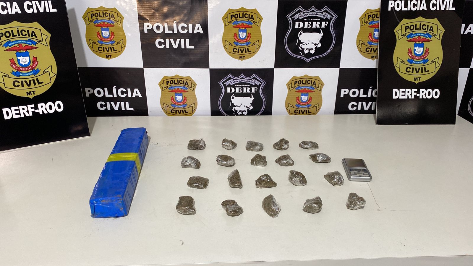 O suspeito de 18 anos foi autuado em flagrante por tráfico de drogas. Com ele foram apreendidos um tablete grande e mais de 20 porções de maconha, além de uma balança de precisão.