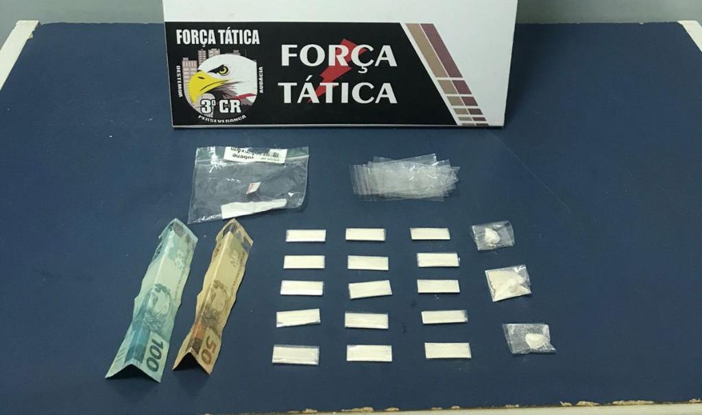 Inicialmente, na noite de sexta-feira, a Força Tática do 3º Comando Regional agiu sobre uma denúncia anônima indicando a venda de drogas por dois homens em um bar no bairro Jardim das Violetas. Os suspeitos, supostamente vinculados a uma facção criminosa, foram encontrados e detidos com 18 porções de uma substância similar à cocaína e R$ 150 em dinheiro.