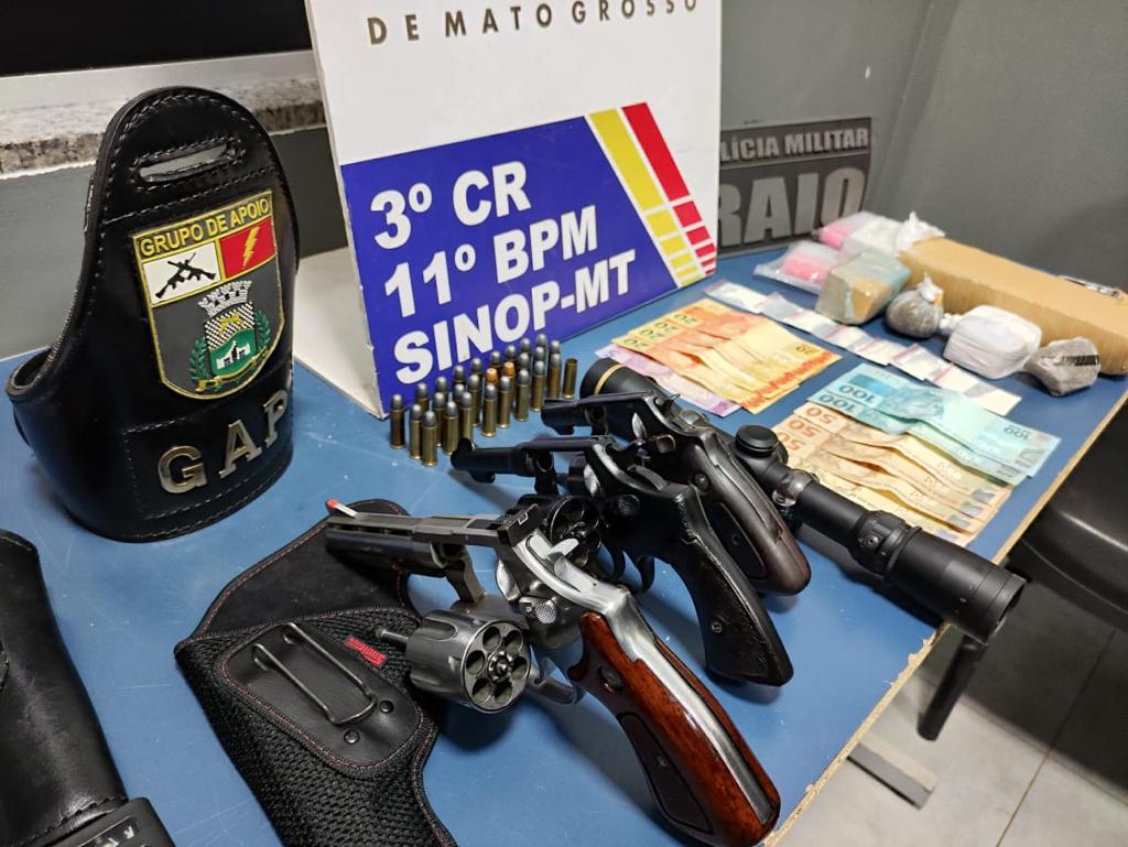 Os policiais do Grupo de Apoio foram acionados para dar suporte na ocorrência e, em seguida, fizeram abordagem dos suspeitos. Com eles foram encontradas uma porção de cocaína e uma arma de fogo. Em buscas na residência, os policiais encontraram, em cima da mesa da cozinha, duas armas de fogo tipo revólver, uma luneta e uma balança de precisão.