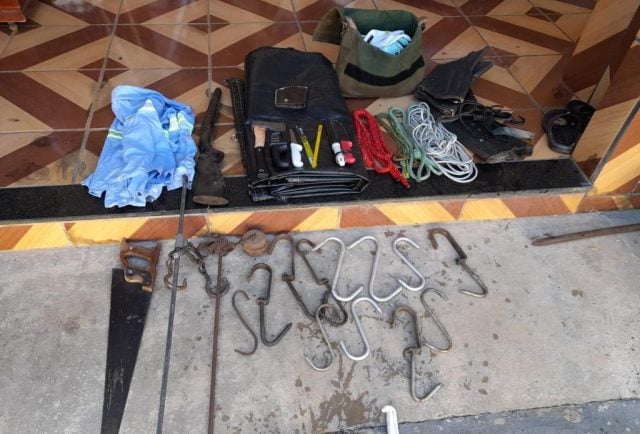 Foram apreendidos duas camionetes, compatíveis com aquelas verificadas durante os furtos, e duas armas de fogo, além de diversos apetrechos característicos com a prática dos crimes (cordas, talhas, catracas, correntes, ganchos). Também foi apreendido um motor tipo guindaste, acionado por controle remoto, com capacidade para içar mais de uma tonelada.