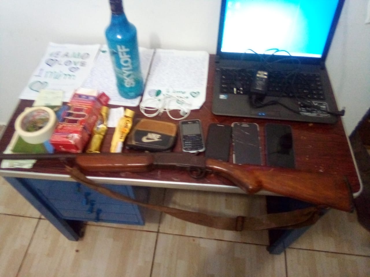 Ao fazer a vistoria na casa do homem, os policiais encontraram roupas da adolescente, tinta de cabelo, três cartas escritas pela jovem, dinheiro, folhas de cheque e quatro aparelhos celulares, além de uma fita crepe larga e uma espingarda de calibre 22, sem numeração.
