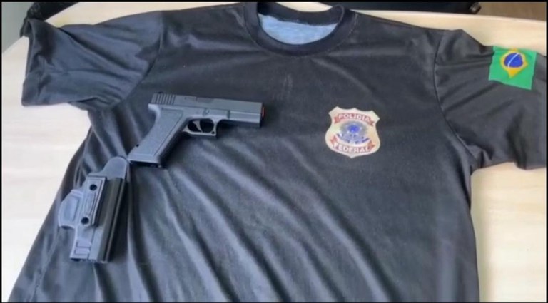 No momento da prisão, o indivíduo encontrava-se em um bar ingerindo bebidas alcóolicas, vestido com uma camiseta idêntica (falsa) a da Polícia Federal e portando um simulacro de arma de fogo.