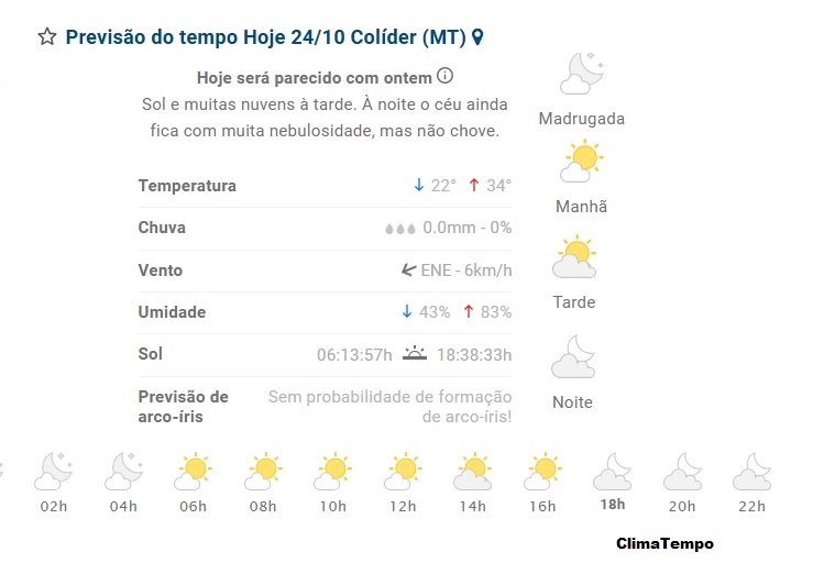 Início Meio Ambiente PREVISÃO DO TEMPO EM COLIDER MT NESTA SEXTA-FEIRA(24) AGRONOTÍCIASMeio Ambiente PREVISÃO DO TEMPO EM COLIDER MT NESTA SEXTA-FEIRA(24) Por Folha de Colíder - 24 de outubro de 2025 541 0 FacebookTwitterPinterestWhatsApp