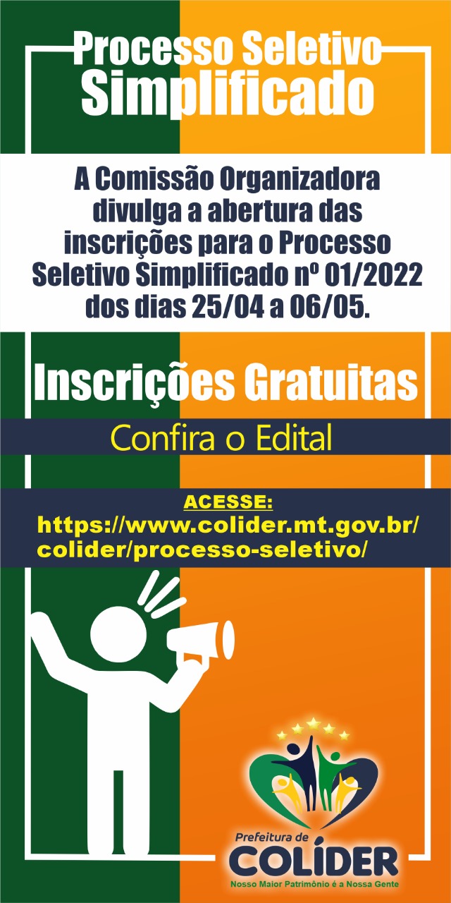 Edital de Processo Seletivo Simplificado N º 001/2022, da Prefeitura Municipal de Colider, divulgado nesta quarta-feira(20), oferece 150 vagas para cargos diversos, sem taxa de inscrição, a qual deve ser feita entre os dias úteis de 25 de abril de 2022 a 06 de maio de 2022. Veja edital completo
