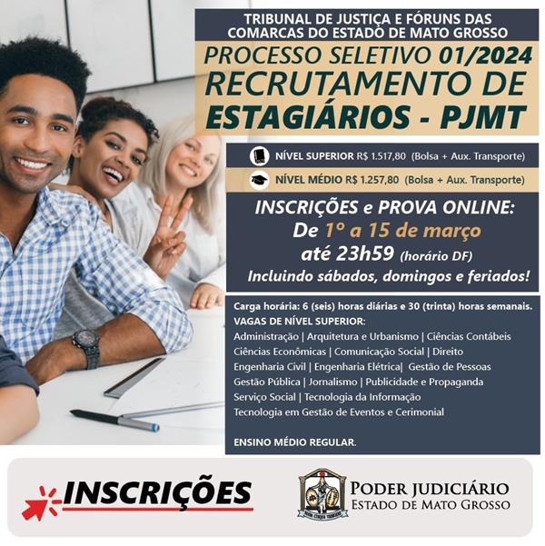 O Tribunal de Justiça de Mato Grosso abriu processo seletivo para seleção de estagiários de nível médio e nível superior para atuação na sede do TJMT e nas comarcas. Podem participar estudantes matriculados a partir do 1º ano do Ensino Médio regular ou EJA, com idade mínima de 16 anos completos, e estudantes de 15 cursos de graduação matriculados a partir do 2º semestre e do 3º semestre, no caso do curso de Direito, distante seis meses do término do curso.